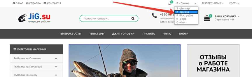 По умолчанию валюта на сайте - гривна. Чтобы выбрать другую валюту достаточно в соответственном поле выбрать нужную валюту.