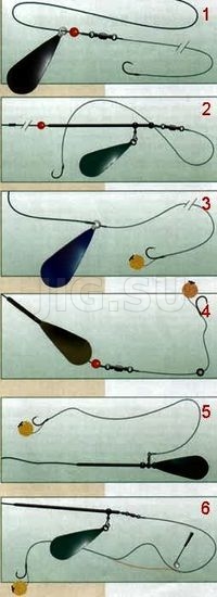 Известная многие десятилетия скользящая оснастка является одной из самых простых. Удобна при ловле средних и мелких карпов. Ее простота, если не сказать примитивность, не создает никаких проблем. Растительная или животная приманка (зерновые, червь и пр.) является здесь наиболее подходящей. Она насаживается прямо на простой крючок. Однако, если рыбалка оказалась более сложной, чем вы предполагали, используйте насадку на "волосе", которая более подходит для осторожных поклевок. 2. Удочка с противозакручивателем Эта снасть - вариант предыдущей. Леска проходит через пластиковую трубку, более или менее твердую, которая уменьшает спутывание. Трубочку можно сделать скользящей и ограничить ее скольжение стопорным узлом, или закрепить ее жестко. Второй вариант предполагает самоподсечку рыбы (удобно, если вы оставляете снасть без присмотра). 3. Глухая оснастка Эта снасть является основной для всех любителей карпов. Она отличается длиной поводка и тем, что она не скользит. Запомните, что очень короткий поводок повышает чувствительность и дальность заброса. Считается, что поводок длиной 20 - 40 см увеличивает дальность примерно на 10%. Очень короткий поводок является также гарантией быстрой засечки, так как у карпа нет времени для реагирования. 4. Плавающая снасть Этот тип используется, когда вы ловите на дне, покрытом тиной или водорослями. В таких условиях вам необходимо подать приманку так, чтобы она была хорошо видна рыбе, то есть находилась над поверхностью водорослей. Также ее можно использовать при толстом слое жидкого ила, в который зачастую проваливается насадка. Плавучесть достигается одним или несколькими шариками (пластинками, кубиками) пенопласта или пенки, насаженными на крючок между составными частями насадки (например зернами кукурузы). Для того, чтобы ограничить высоту всплытия, на поводок крепится небольшая свинцовая дробинка. Насадка всплывет на высоту, равную расстоянию от крючка до дробинки. 5. Вертолет Эта снасть разработана для достижения максимальной дальности заброса. Ее нужно использовать с тяжелым грузилом (около 100 граммов), имеющим обтекаемую форму. Грузило на пластиковой трубочке в данном случае является основной несущей конструкцией, на которую устанавливается поводок. 6. Снасть с амортизатором Вся хитрость этой снасти заключается в специальной тонкой эластичной резинке. Конструкция видна из рисунка. Преимущество - рыба, взявшая насадку, может свободно плыть, заглатывая приманку все глубже, пока не натянется леса. После этого происходит самоподсечка (если груз закреплен жестко), либо поклевка передастся на сигнализатор, и все будет зависеть от Вас. Вам может пригодиться:Джиг-головкиВиброхвостыТвистерыГрузилаТовары для отдыха и туризма |